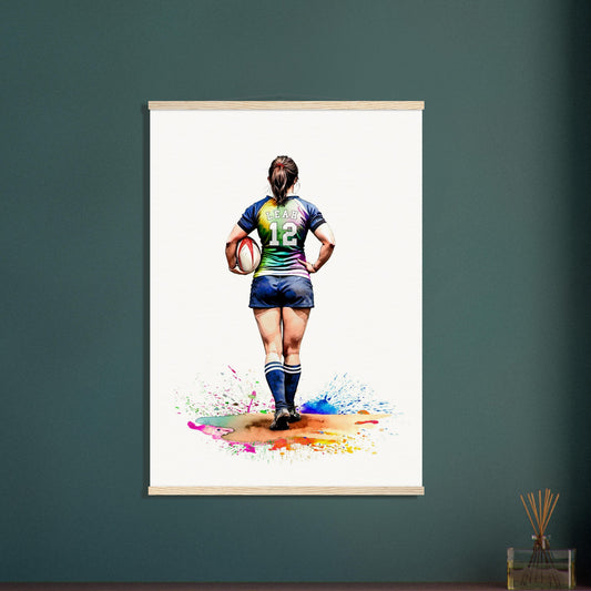 Personalised Rugby Player Poster | Museum-Grade Print with Wooden Hanger for Women