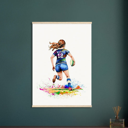 Personalised Rugby Player Poster | Museum-Grade Print with Wooden Hanger for Girls
